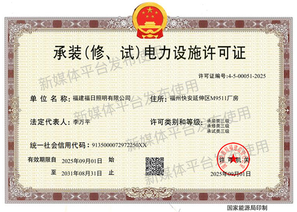 近日,福日電子成員企業(yè)福日照明順利通過國家能源局福建監(jiān)管辦公室核準,成功取得承裝(修、試)電力設施許可證(三級)資質。這標志著福日照明已具備承接35kV及以下電壓等級電力設施的安裝、維修和試驗業(yè)務的全面能力,為企業(yè)進一步拓展電力工程市場提供了堅實保障。